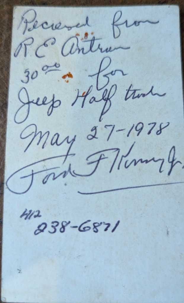 When my dad got home I relayed the message and he immediately got out Bart Vanderveen’s book and turned to the page. Needless to say we called and made arrangements to go see it. It was within 30 miles for where we lived in Somerset, PA. We bought it immediately. I recently found the receipt written on the back of a business card with the receipt.